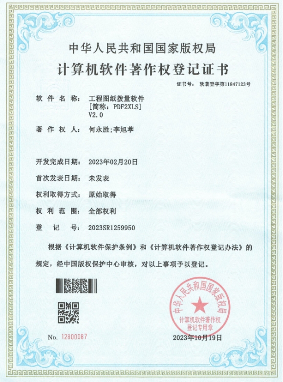 近日,公司取得由國家版權局頒發的《工程圖紙撥量軟件》著作權登記證書。這是公司繼《企業短信群發系統》《企業外經證業務管理系統》后獲得的第3項計算機軟件著作權登記證書。