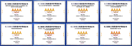 這9個獲獎項目分別是東北公司承建的恒力石化(大連)160萬噸/年高性能樹脂及新材料項目42/26萬噸/年苯酚丙酮工程榮獲5A級優質精品工程獎;西部公司承建的福建申遠新材料有限公司三期年產20萬噸聚酰胺一體化項目年產20萬噸環己酮裝置、福泉至甕安天然氣輸氣管道項目(1#閥室及福泉段)、安徽六國化工磷肥生產線節能降碳技術升級改造項目10萬噸/年電池級(85%)磷酸裝置、中國航油西南儲運基地項目、廣西鵬越20萬噸/年半水-二水濕法磷酸及精深加工項目10萬噸/年凈化磷酸及配套工程,華東公司承建的恒力石化(大連)160萬噸/年高性能樹脂及新材料項目1#24萬噸/年雙酚A工程,華南公司承建的惠州立拓30萬噸/年聚烯烴新材料項目,中南公司承建的成品油能力建設371處工程等8個項目獲評4A級優質工程獎。