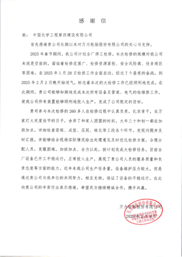 近日,華南公司從化萬力輪胎三期項目團隊收到萬力輪胎股份有限公司發來的感謝信。信中高度贊揚公司項目團隊在2025年春節期間高效完成全廠停工大檢修任務,以專業能力和責任擔當助力業主實現“開門穩、開門紅”。